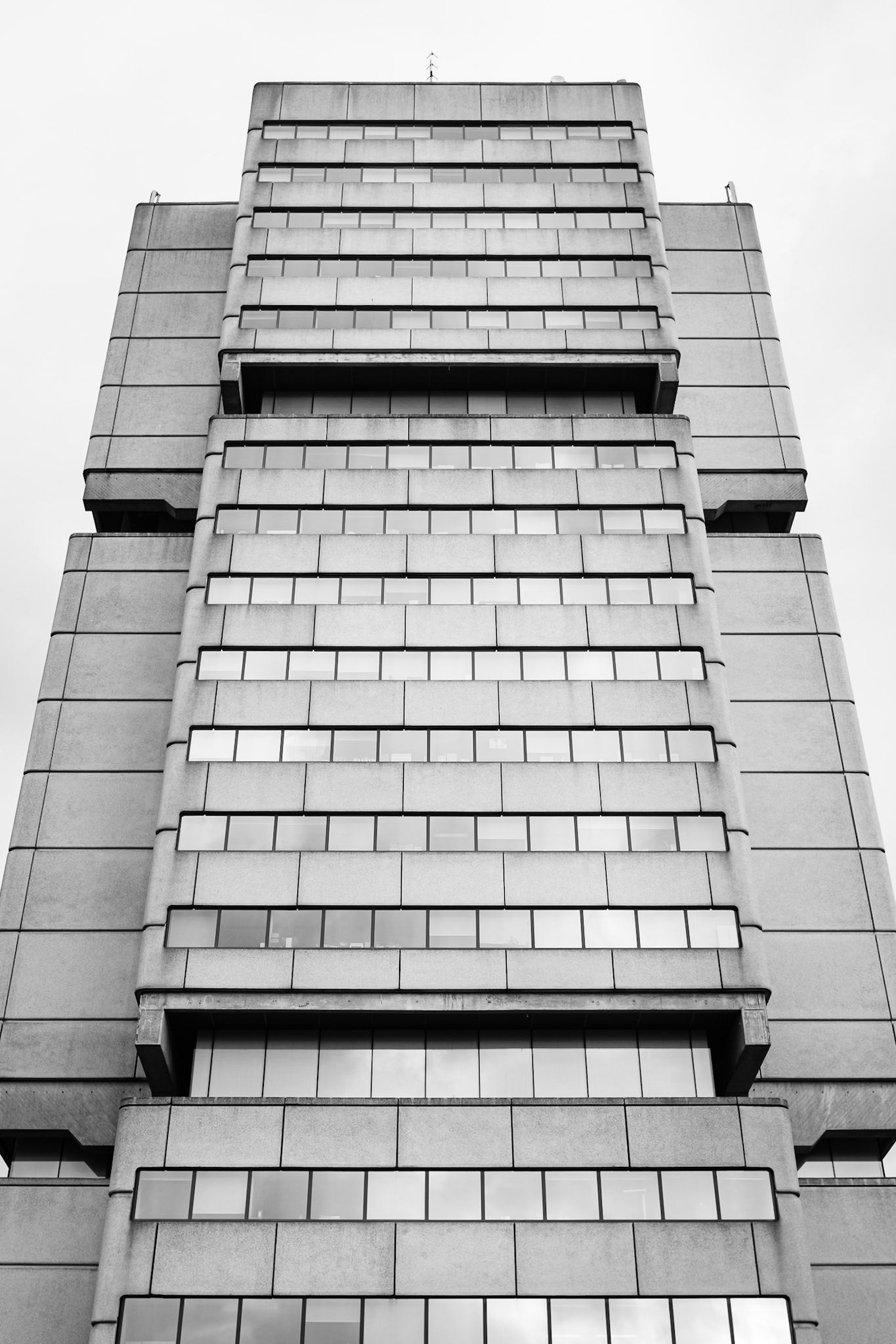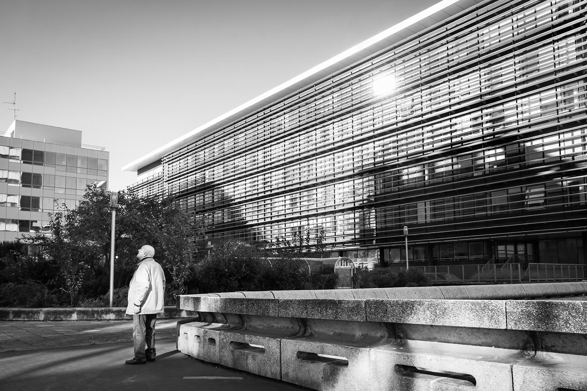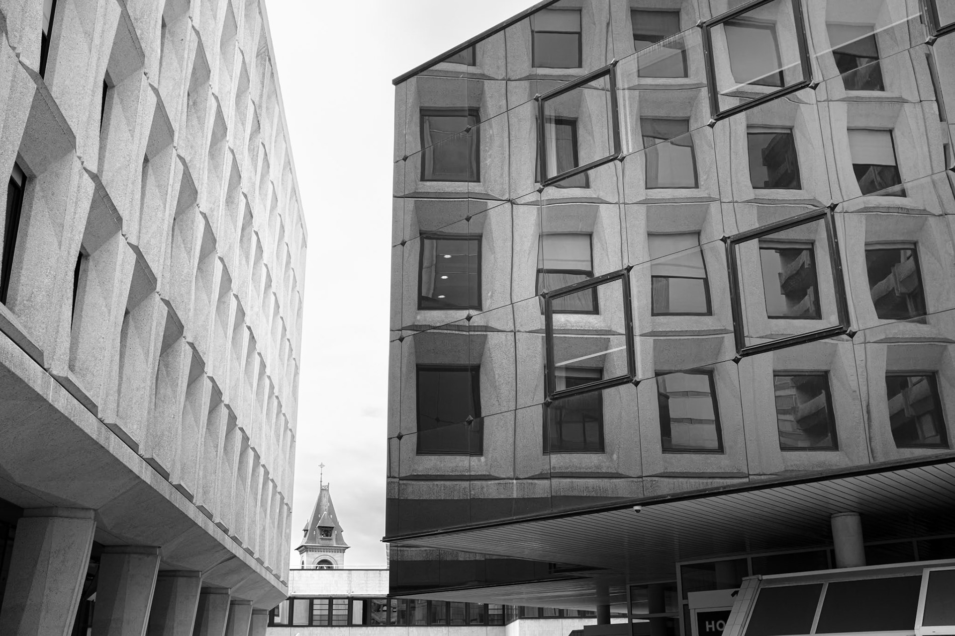 Mériadeck, ancien marais asséché, transformé puis remanié au cours du XXᵉ siècle, se déploie comme un plateau : dalles, passerelles, façades en béton précontraint forment des plans superposés où s’inscrivent des rythmes visuels.